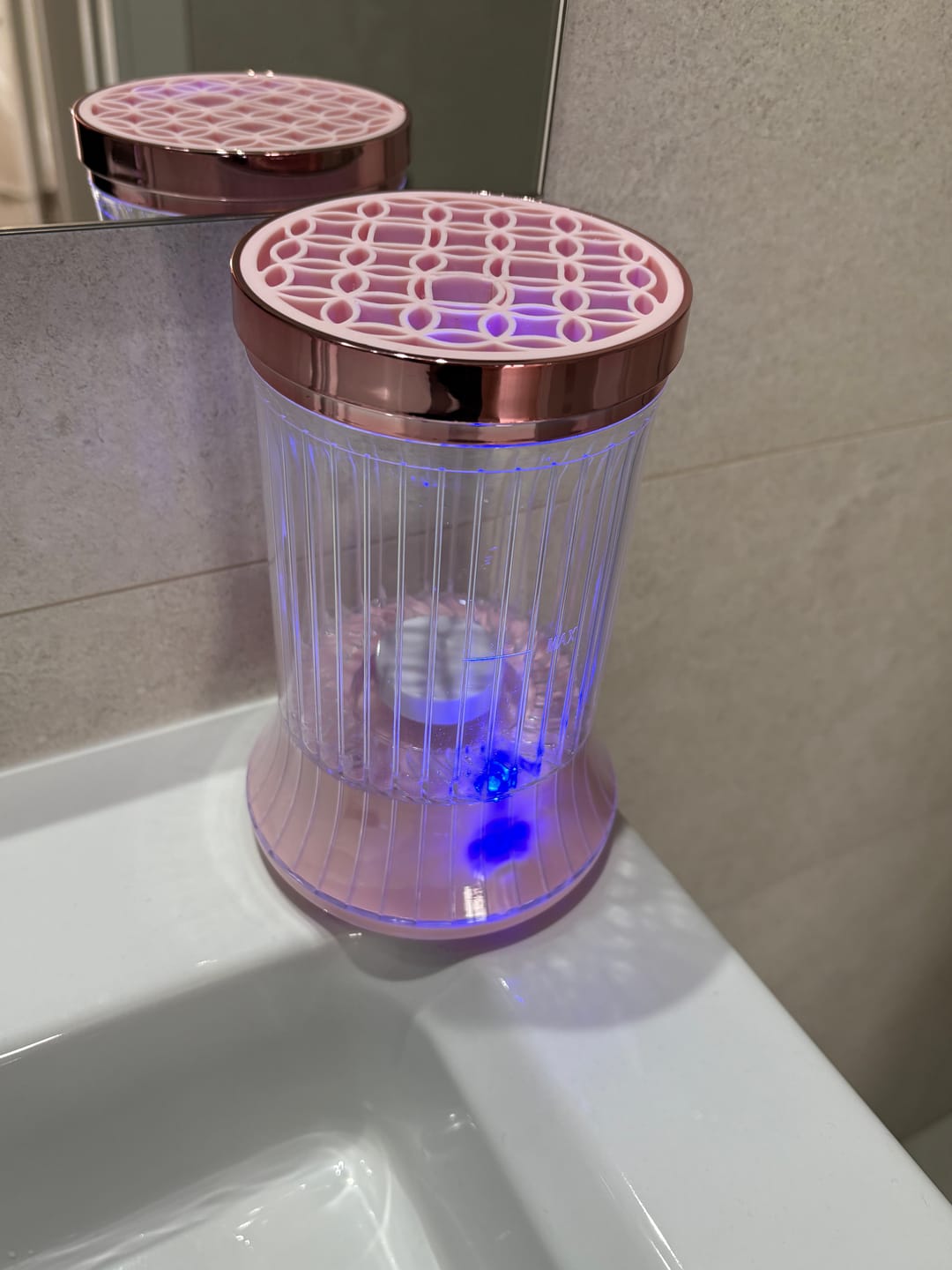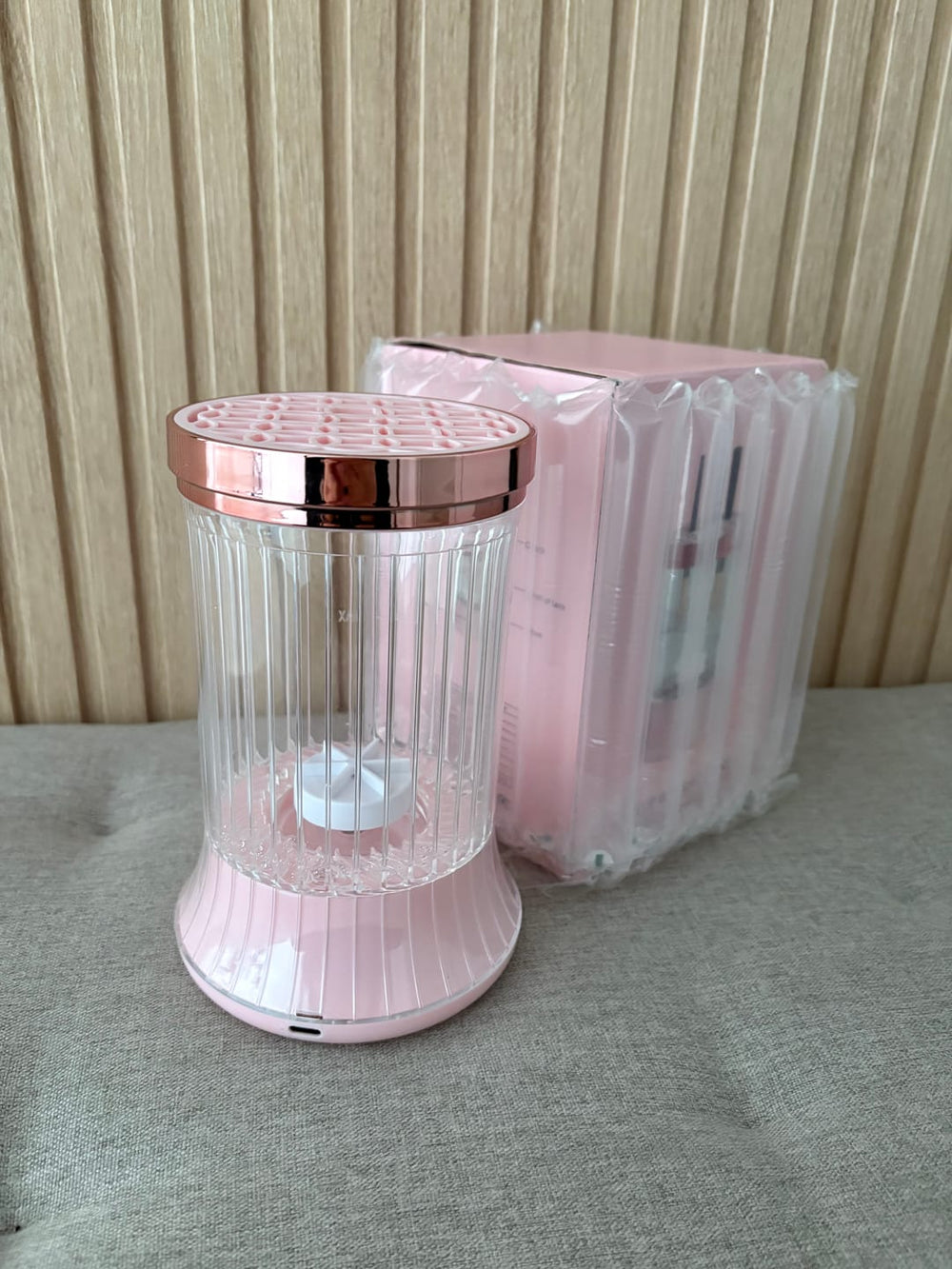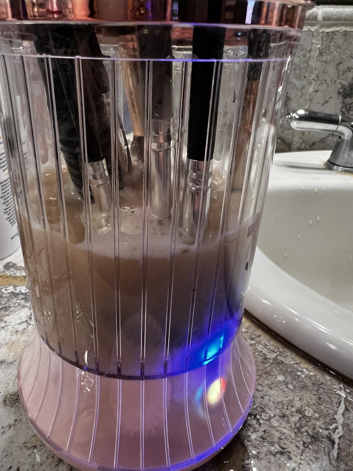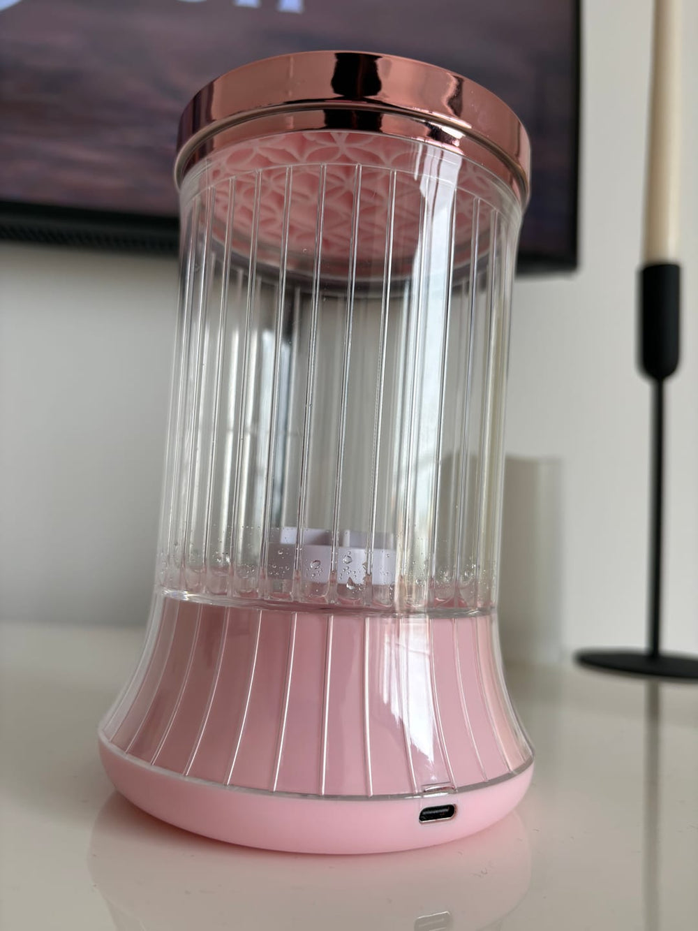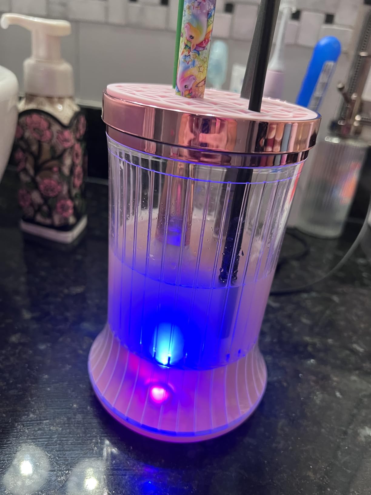 Jeg er så imponert over hvor enkel og effektiv den er! Bare fyll på vann og rengjøringsmiddel, trykk på knappen og la den gjøre jobben – børstene mine var som nye på bare noen minutter! Denne lille maskinen er virkelig en livredder både for børstene mine og huden min!